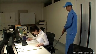 Japanese assistant gets her pussy fingered and fucked by a horny guy